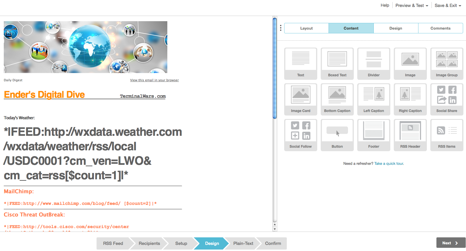 MailChimp at its heart is an email campaign service and while we all aren’t business owners you can still leverage this free service to help keep track on anything and everything important to you! After you create your account, select the RSS Driven Campaign and run through the workflow (see below), I set mine to deliver everyday at 6AM. The process is super easy and very similar to Aqua Page Builder.